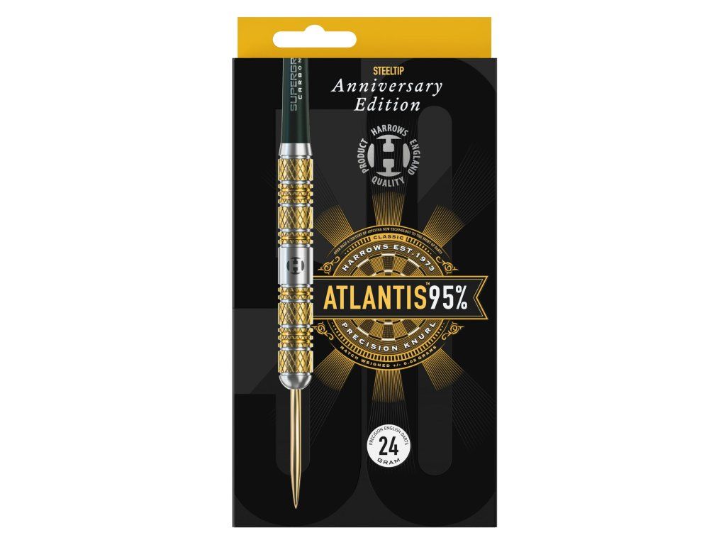 Šipky Atlantis jsou osazeny karbonovými násadkami Midi Supergrip a jubilejními 100mikronovými letkami Harrows Anniversary, které jsou potaženy odolným zlatým nitridem titanu.