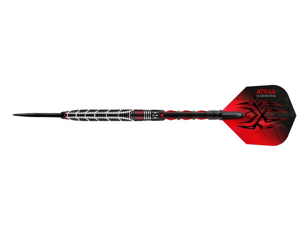 Prémiová šipka z 95% wolframu má originální vzhled, a díky prstencovým zářezům jedinečný grip.Uhrančivý vzor ve stylu Atraxe (pavouk z rodu sklípkanů) byl vyfrézován na prvotřídních CNC strojích. Černá, odolná vrstva nitridu titanu spolu s metalickou červení podporují podmanivý vzhled těchto šipek.