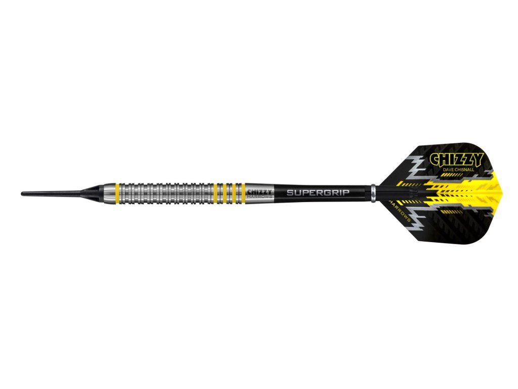 Wolframové šipky Chizzy 80% navazují na úspěšný loňský model Chizzy 90%, který vznikl ve spolupráci se světovou jedničkou Davem „Chizzy“ Chisnallem.Paralelní, 51 mm dlouhý barel je, podobně jako u předchozího modelu, rozdělen do tří zón – dvojité žraločí drážky vpředu a vzadu doplňuje středový segment s dvojitými plochými prstenci. Precizně zpracovaný povrch zajišťuje konzistentnost při kladení prstů a jistotu v odhodech. Pět proužků v zářivě žluté Chizzyho barvě završuje vizuální vzhled této řady.