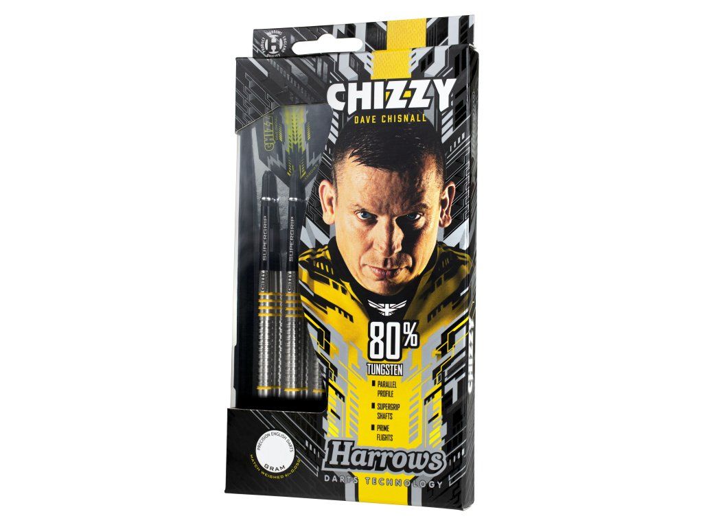 Wolframové šipky Chizzy 80% navazují na úspěšný loňský model Chizzy 90%, který vznikl ve spolupráci se světovou jedničkou Davem „Chizzy“ Chisnallem.Paralelní, 51 mm dlouhý barel je, podobně jako u předchozího modelu, rozdělen do tří zón – dvojité žraločí drážky vpředu a vzadu doplňuje středový segment s dvojitými plochými prstenci. Precizně zpracovaný povrch zajišťuje konzistentnost při kladení prstů a jistotu v odhodech. Pět proužků v zářivě žluté Chizzyho barvě završuje vizuální vzhled této řady.