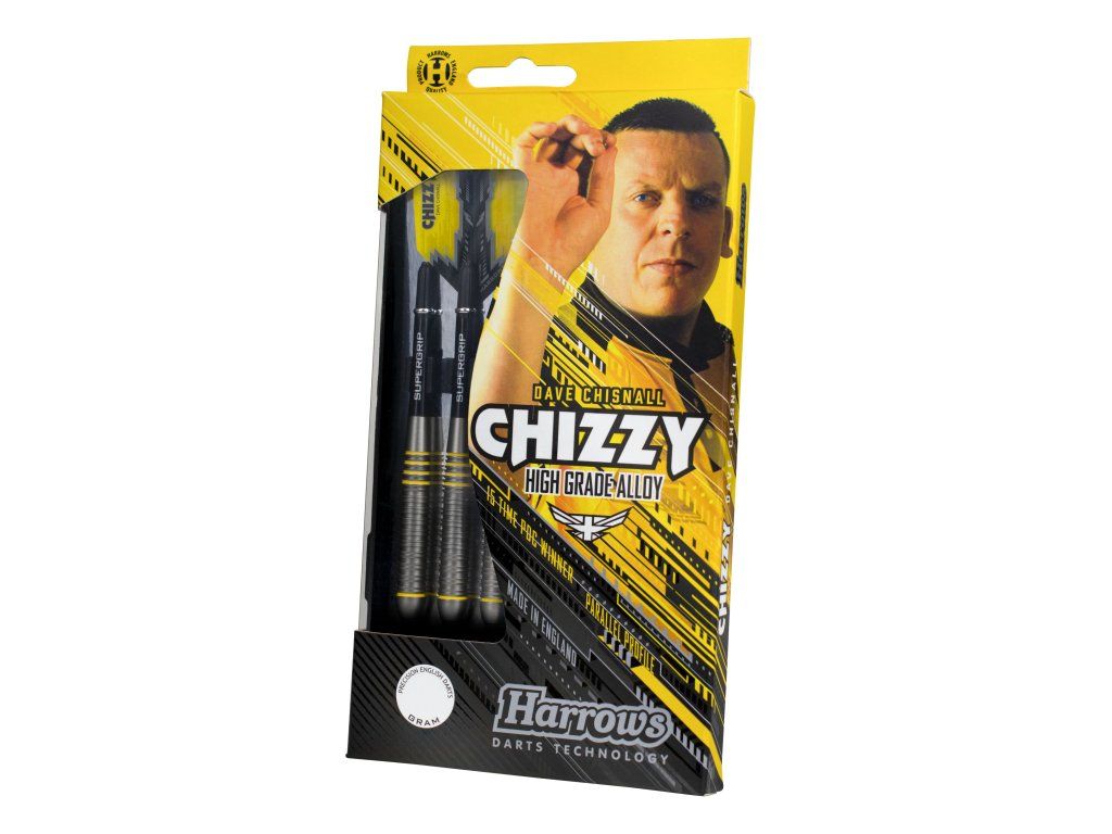 Kolekci wolframových šipek světové jedničky Dava „Chizzy“ Chisnalla rozšiřuje atraktivní řada mosazných šipek Chizzy High Grade Alloy. Ty jsou, stejně jako její wolframové protějšky, rozdělené do tří segmentů - dvojité žraločí drážky vpředu i vzadu a uprostřed dvojité ploché prstence. Nechybí ani pět kroužků v zářivě žluté Chizzyho barvě.Wolframový vzhled šipek je dosažen vysoce kvalitním pokovením. Vzhledově dokonalou formaci završují násadky Black Midi Supergrip a letky Prime.