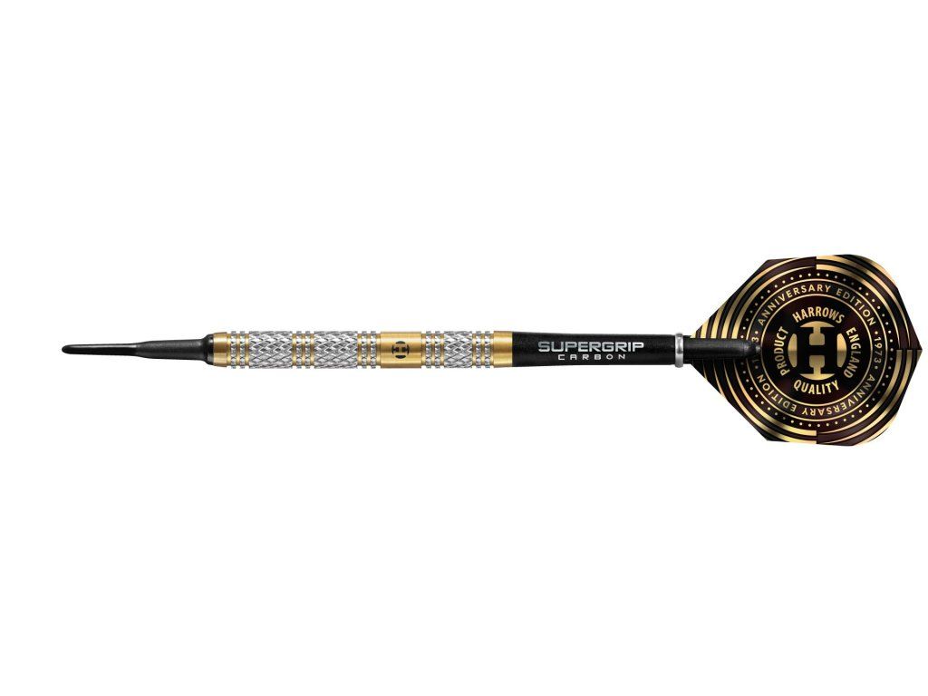 Šipky jsou osazeny karbonovými násadkami Midi Supergrip a jubilejními 100mikronovými letkami Harrows Anniversary, které jsou potaženy odolným zlatým nitridem titanu.