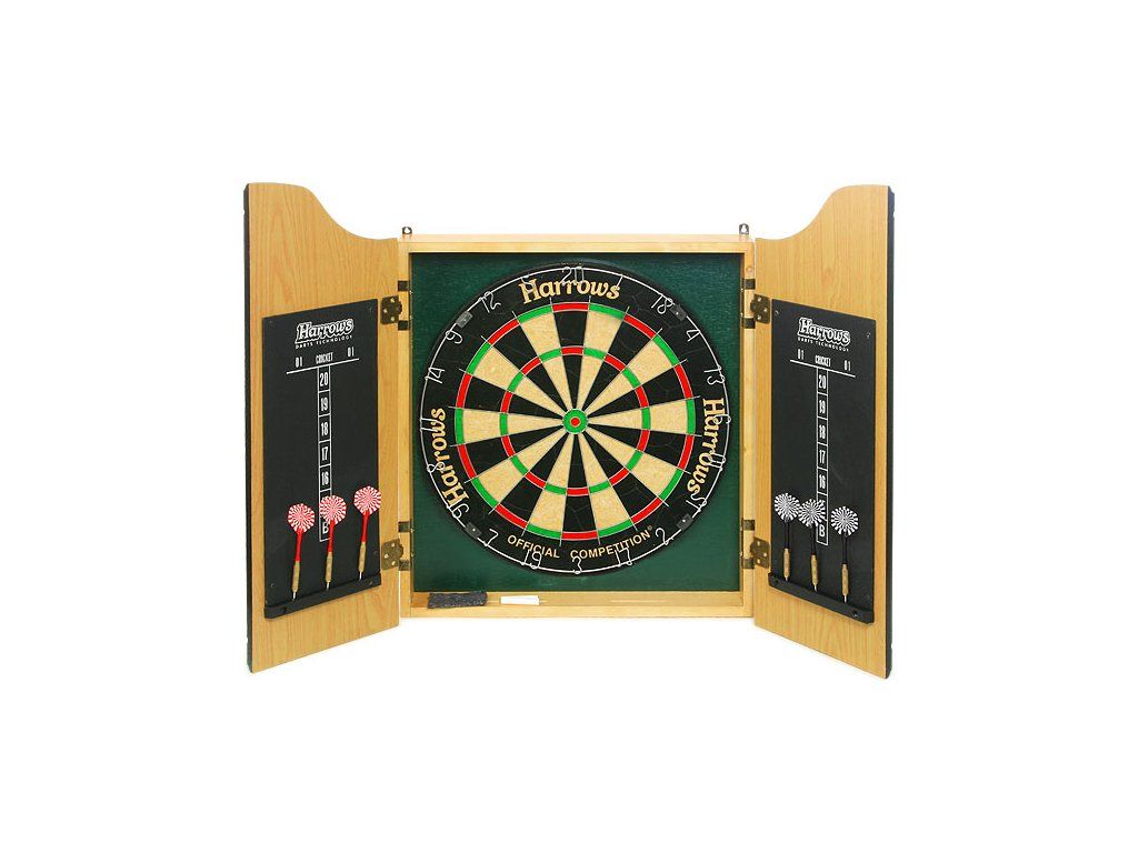 | Balení obsahuje: | Skříňka na terč, sisalový terč Harrows Official Competition, 6x šipky steel, prachovka, křída / Board box, Harrows Official Comp |