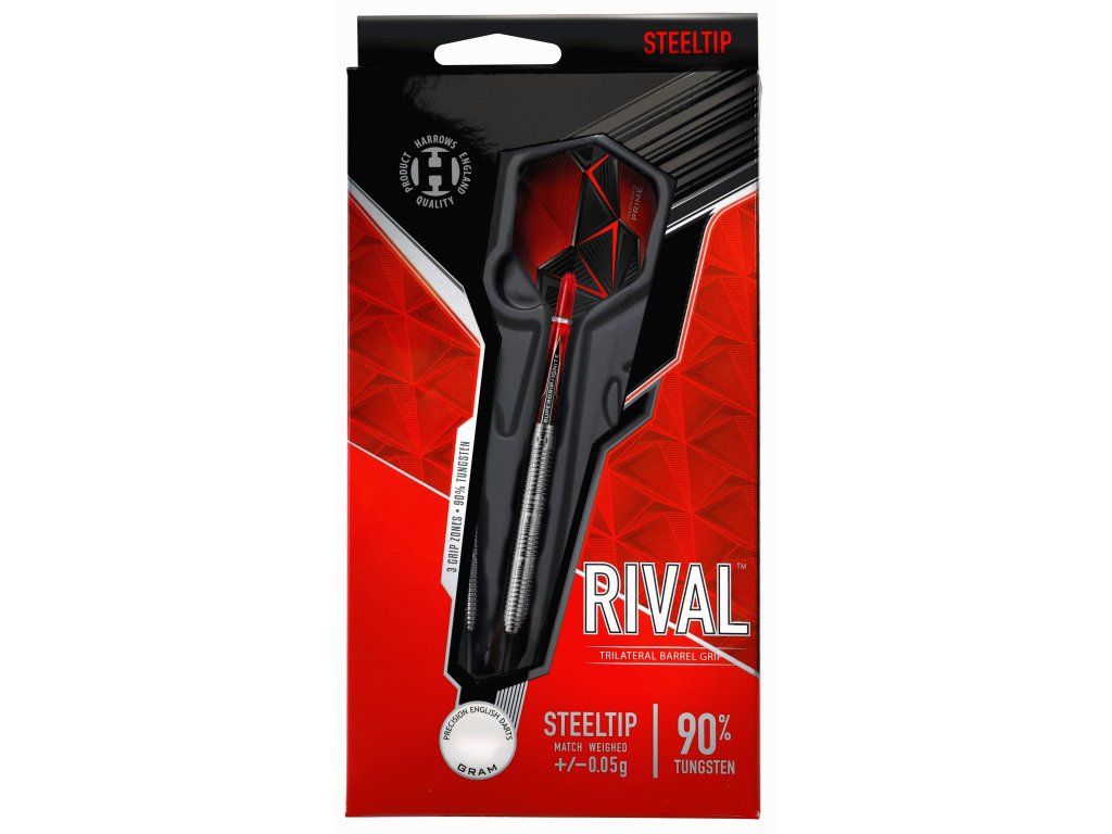 Wolframové šipky Rival jsou ztělesněním jednoduchosti i špičkového výkonu. K tomu hráčům pomůžou tři tvarově výrazné zóny úchopu, které jsou od sebe odděleny dvěma většími drážkami. Přesný prstoklad zajistí konzistentní výkony.Šipky Rival 90% jsou dodávány spolu s násadkami Red Supergrip Ignite Midi a novými 100mikronovými letkami Prime.